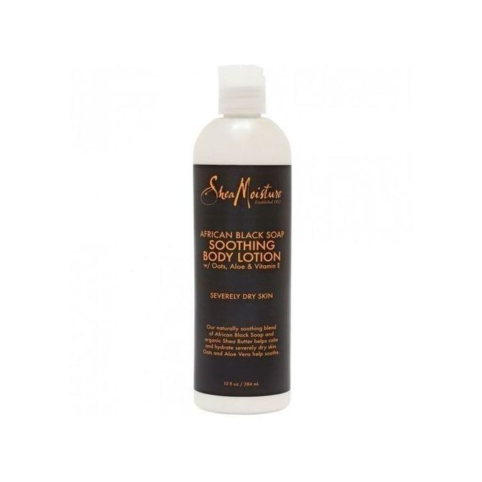 Shea Moisture African Black Soap Soothing Body Lotion helps to calm and moisturize severely dry and sensitive skin. Specially formulated for problem skin, the ultra-rich lotion envelops the body in a nourishing cocoon infused with Oats and Aloe Vera.