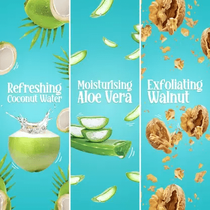 It contains coconut water and Aloe Vera and walnut which is healthy for my the skin, where Alo Vera helps moisturizing skin and walnut exfoliating. It is also suitable for toddlers, kids, teenager in addition to adults. A perfect soap for the entire family.